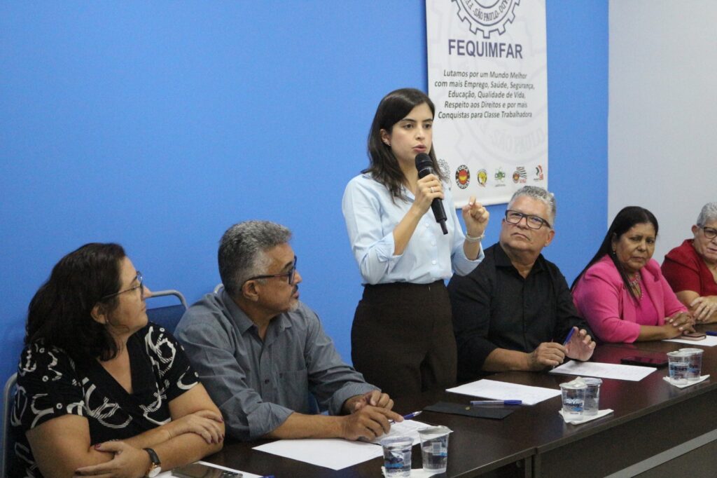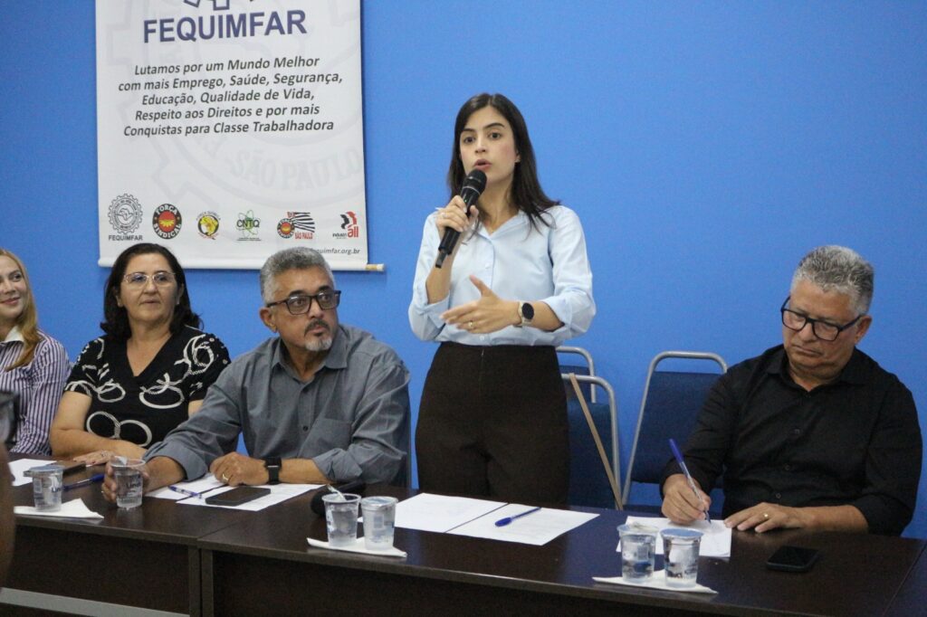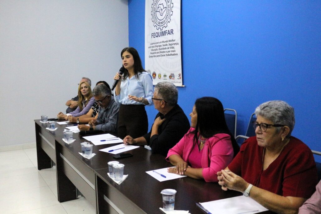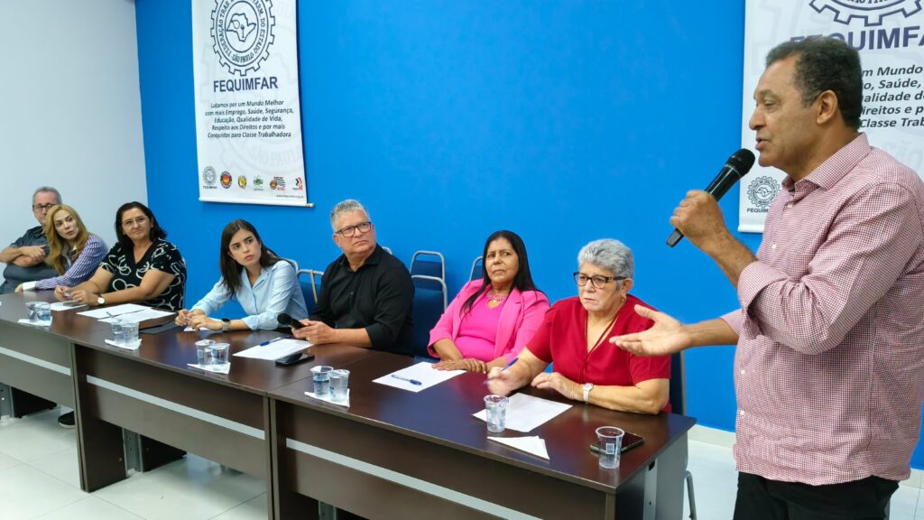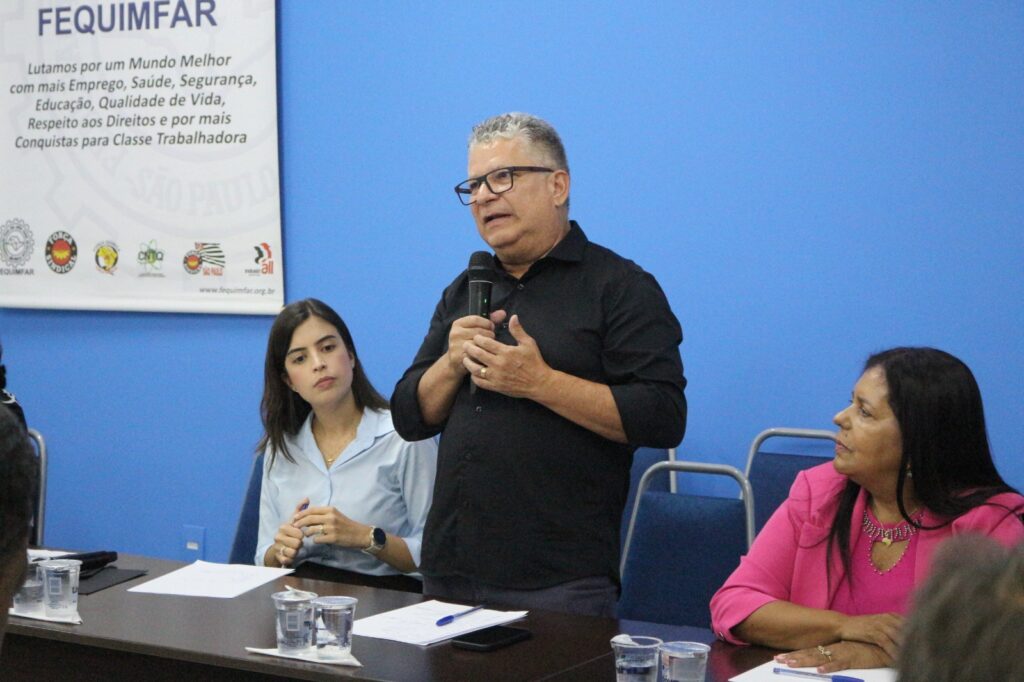 Edson Dias Bicalho, secretário geral da FEQUIMFAR e presidente dos Químicos de Bauru e Região, conduziu o encontro que contou com uma mesa composta por Antonio Silvan Oliveira, presidente da CNTQ e dos Químicos de Guarulhos, Adriana Ramalho, ex-vereadora, Maria Nalva, coordenadora do Departamento de Mulheres e Gênero da FEQUIMFAR e presidente dos Químicos de Jaguariúna, Eunice Cabral, presidente da CONACCOVEST, Maria Auxiliadora dos Santos, secretária nacional de políticas para mulheres da Força Sindical e presidente do STTI Instrumentos Musicais e Brinquedos, e João Henrique dos Santos, presidente dos Plásticos de Jundiaí.