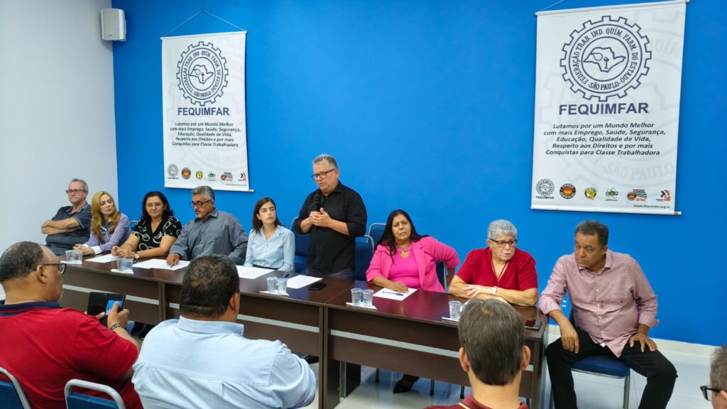 O presidente da FEQUIMFAR e vice-presidente da Força Sindical, Sergio Luiz Leite, Serginho, apresentou um panorama dos setores químico, plástico, farmacêutico, de etanol, instrumentos musicais e brinquedos no estado de São Paulo, destacando as recentes conquistas obtidas por meio das negociações coletivas, como avanços salariais e uma cláusula na Convenção Coletiva do setor farmacêutico que fortalece a luta contra o feminicídio e combate à violência.