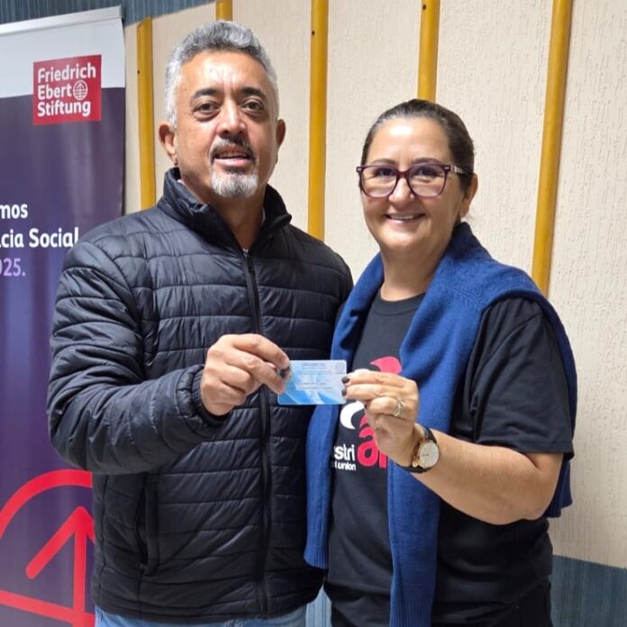 No dia 25 de setembro, Edson Dias Bicalho, secretário geral da FEQUIMFAR, realizou a entrega da credencial à companheira Maria Nalva Vieira Gama, que é presidente do Sindicato dos Químicos, Plásticos e Farmacêuticos de Jaguariúna e Região.