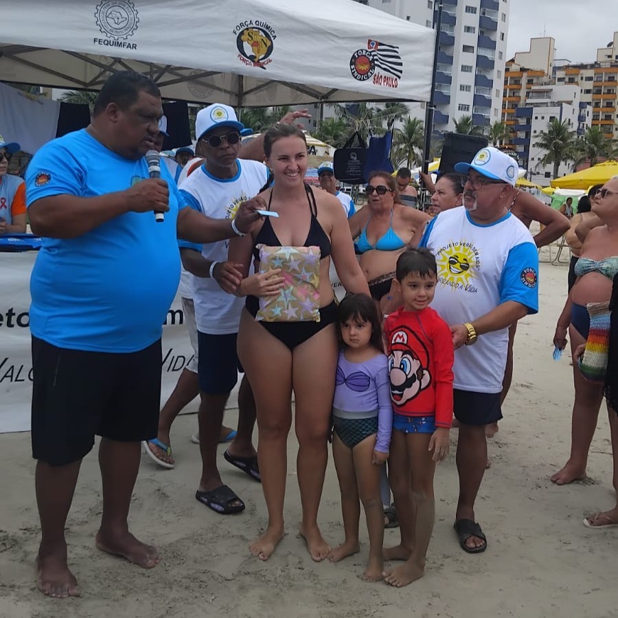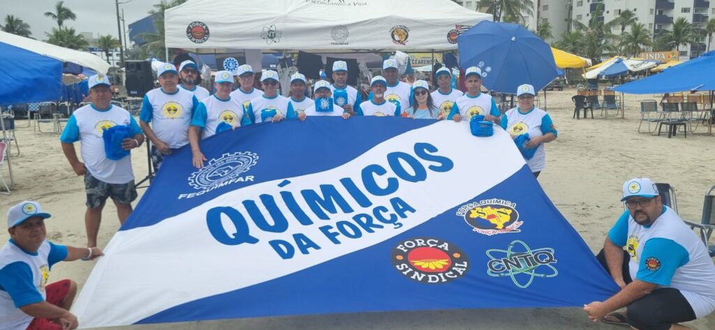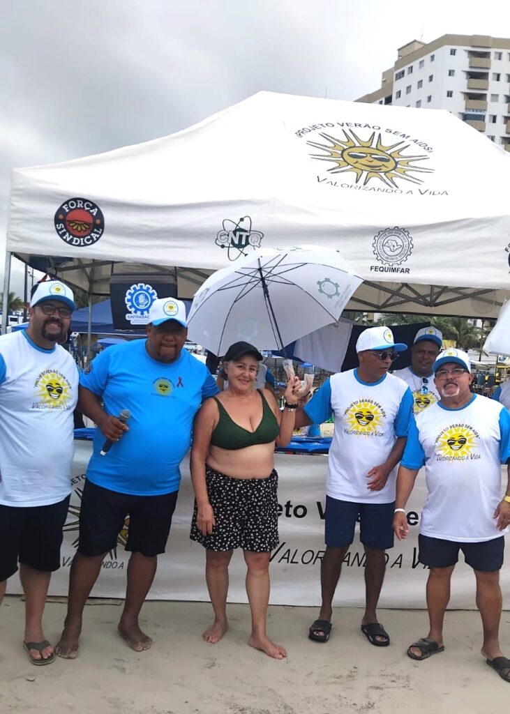 Ao longo do sábado e do domingo, lideranças da FEQUIMFAR e dos Sindicatos filiados estiveram nas proximidades das colônias de férias realizando a distribuição de materiais informativos e de conscientização sobre o HIV/AIDS, além de preservativos e brindes aos banhistas, fortalecendo o diálogo com trabalhadores, suas famílias e a comunidade presente.